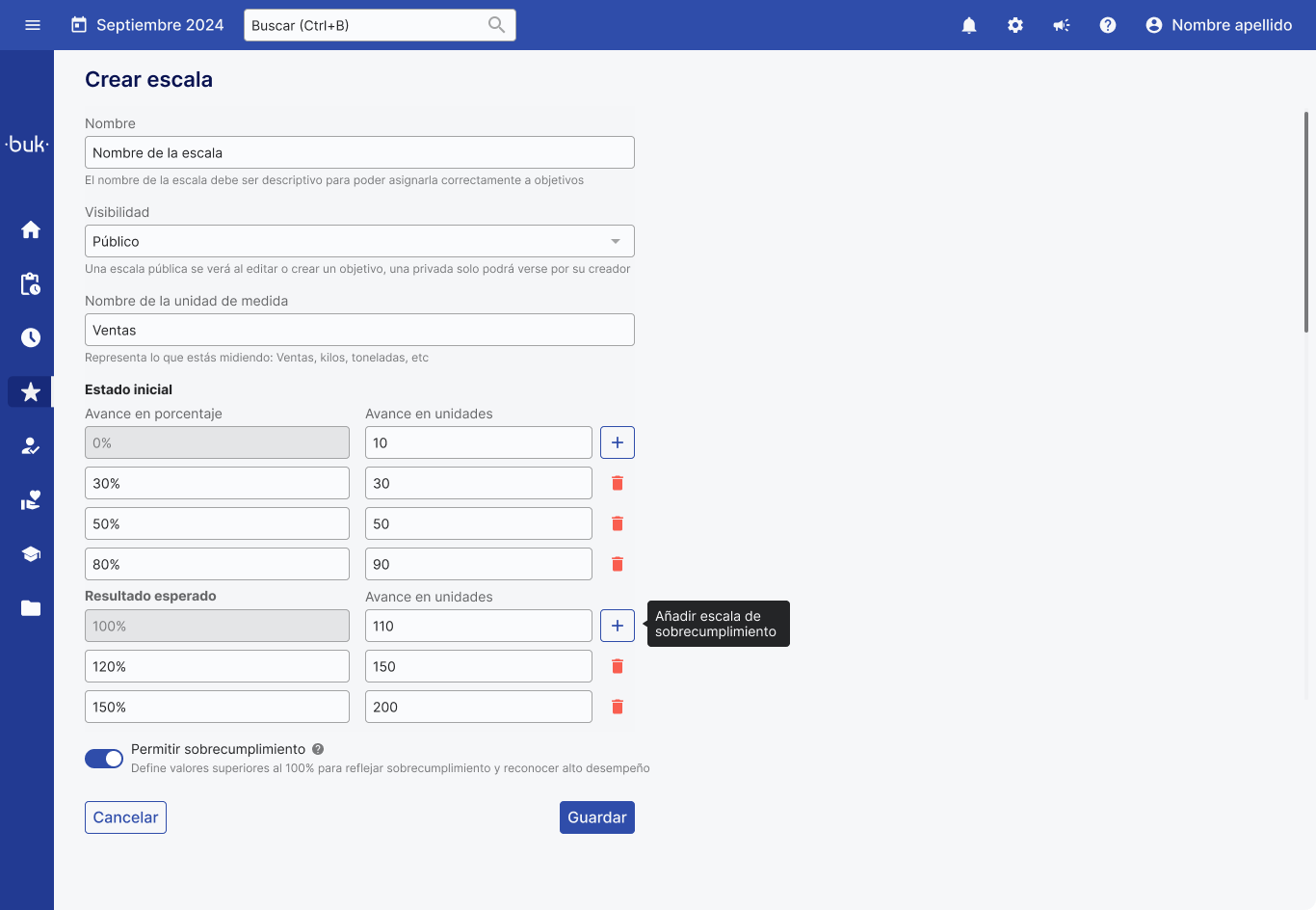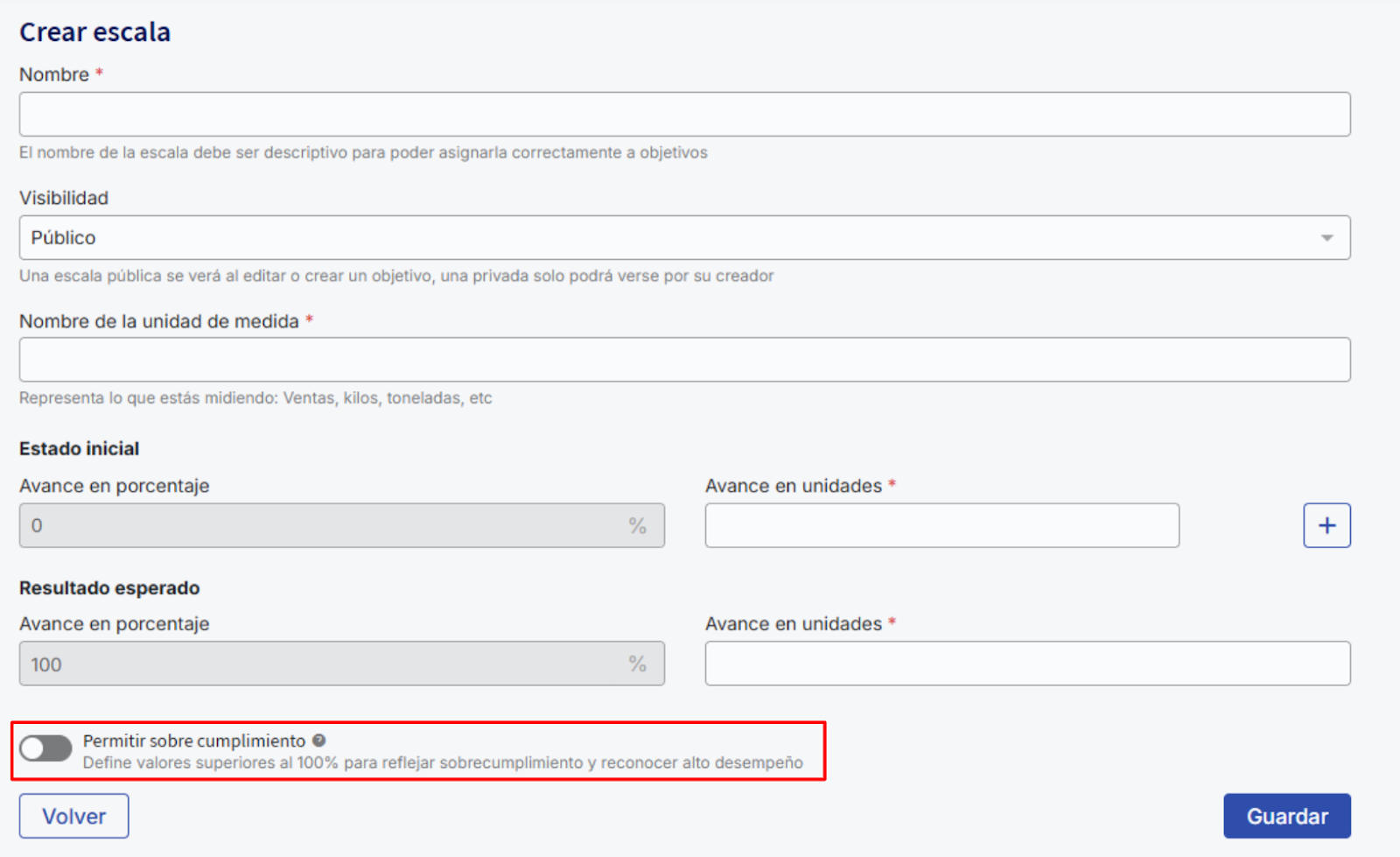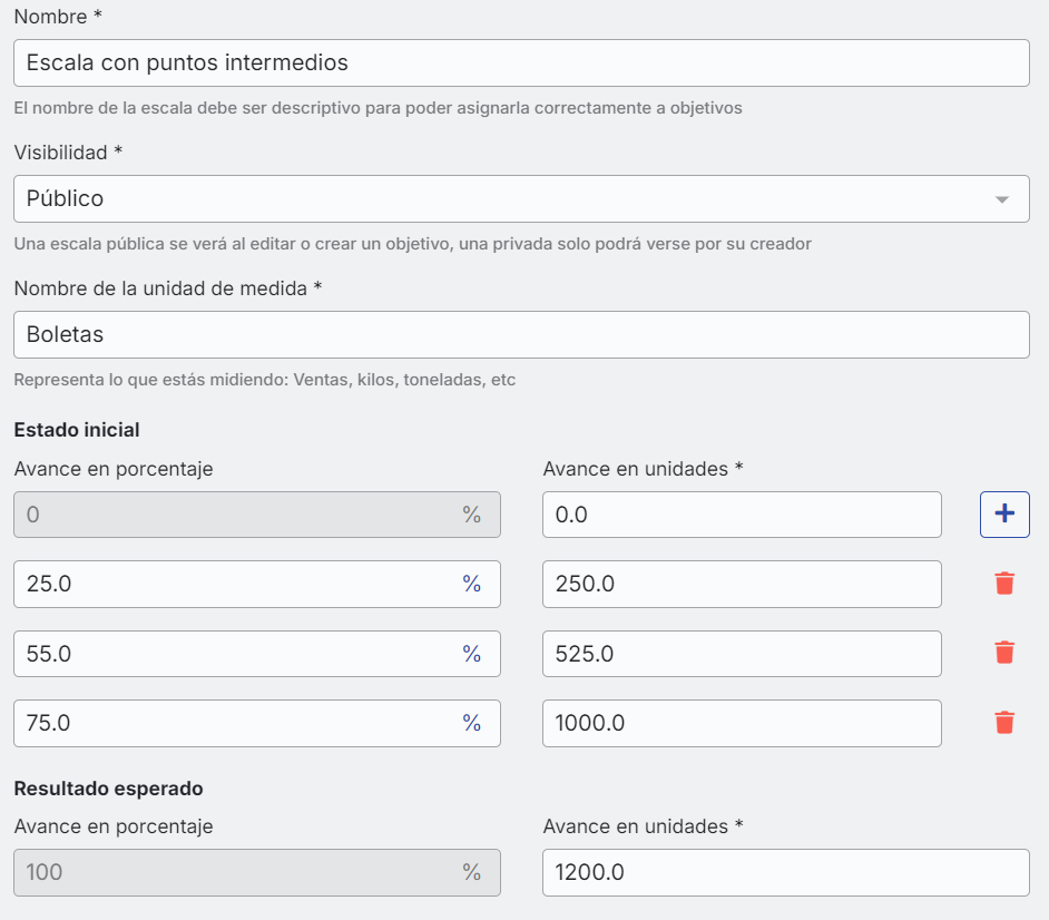 An overachievement scale is one that allows you to record, measure, and reflect progress in meeting a goal that exceeds 100% of the target value. This functionality recognizes and quantifies performance that surpasses the goal by means of scales that include progress points above 100%, thus enabling a more accurate and motivating assessment of performance.
