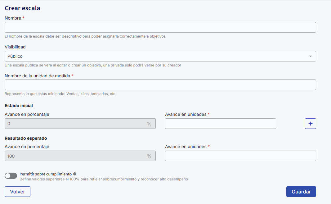 The purpose of this article is to provide a detailed guide on creating, configuring, and using goal progress scales in the performance management module. It is intended for users with an administrator profile or with permissions to create goals. The article explains how to configure custom scales using linear interpolation, for both direct and inverse scales, and includes the possibility of setting up overachievement scales to recognize progress that exceeds 100%. Additionally, clear instructions are provided for assigning goals to collaborators and updating progress.