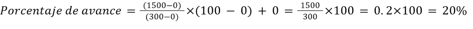On the other hand, if the value falls within thefirst interval(for example,300 units), it is considered that 0% corresponds to0 units(initial value) and 100% to1500 units(final value). The formula in this case is: