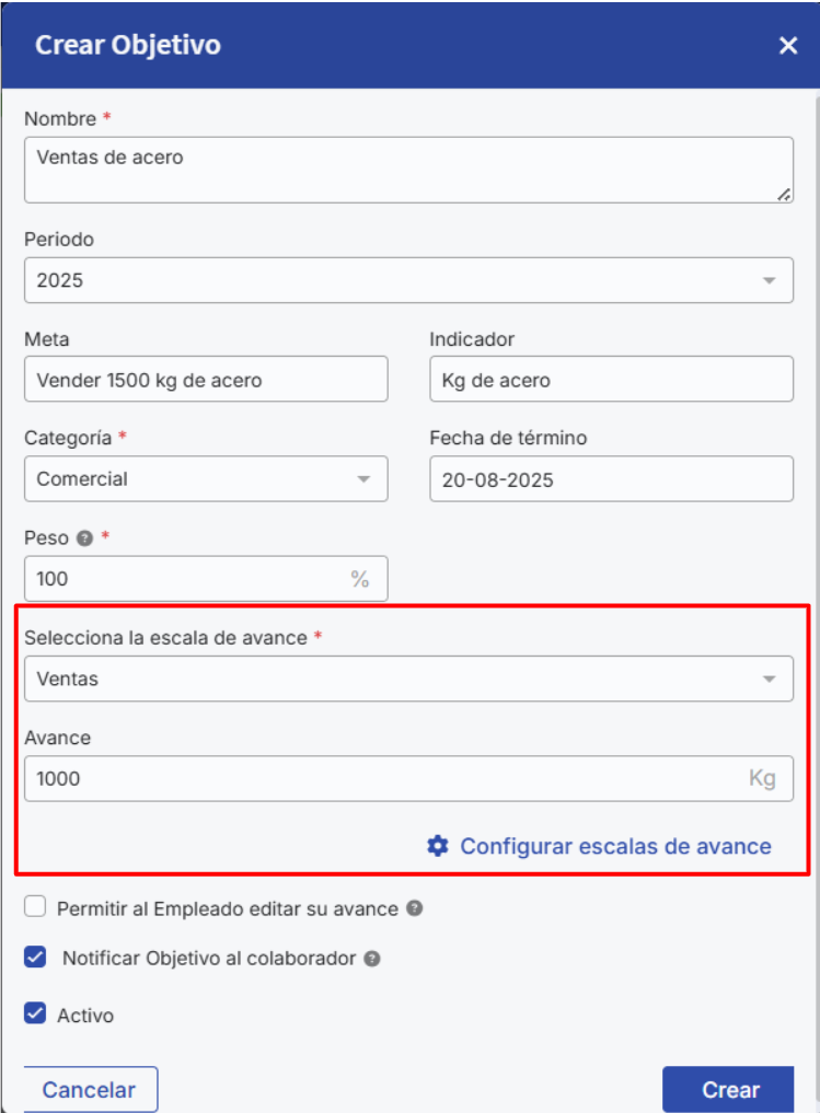 Enter the information related to the goal and select the progress scale. After selecting it, you will see that it indicates the real unit of measurement. You can click on "Configure progress scales" to be automatically directed to this section.