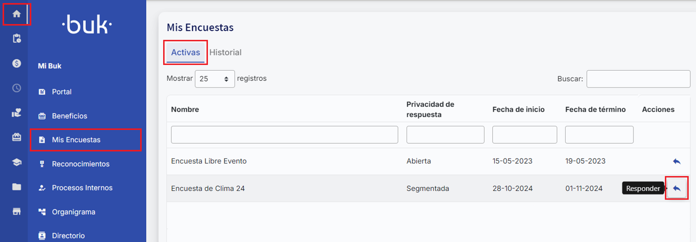 You can also access the survey directly from the platform. To do so, go to "My organization" and select "My surveys". On the "Active" tab you will find the surveys you have pending to respond to.