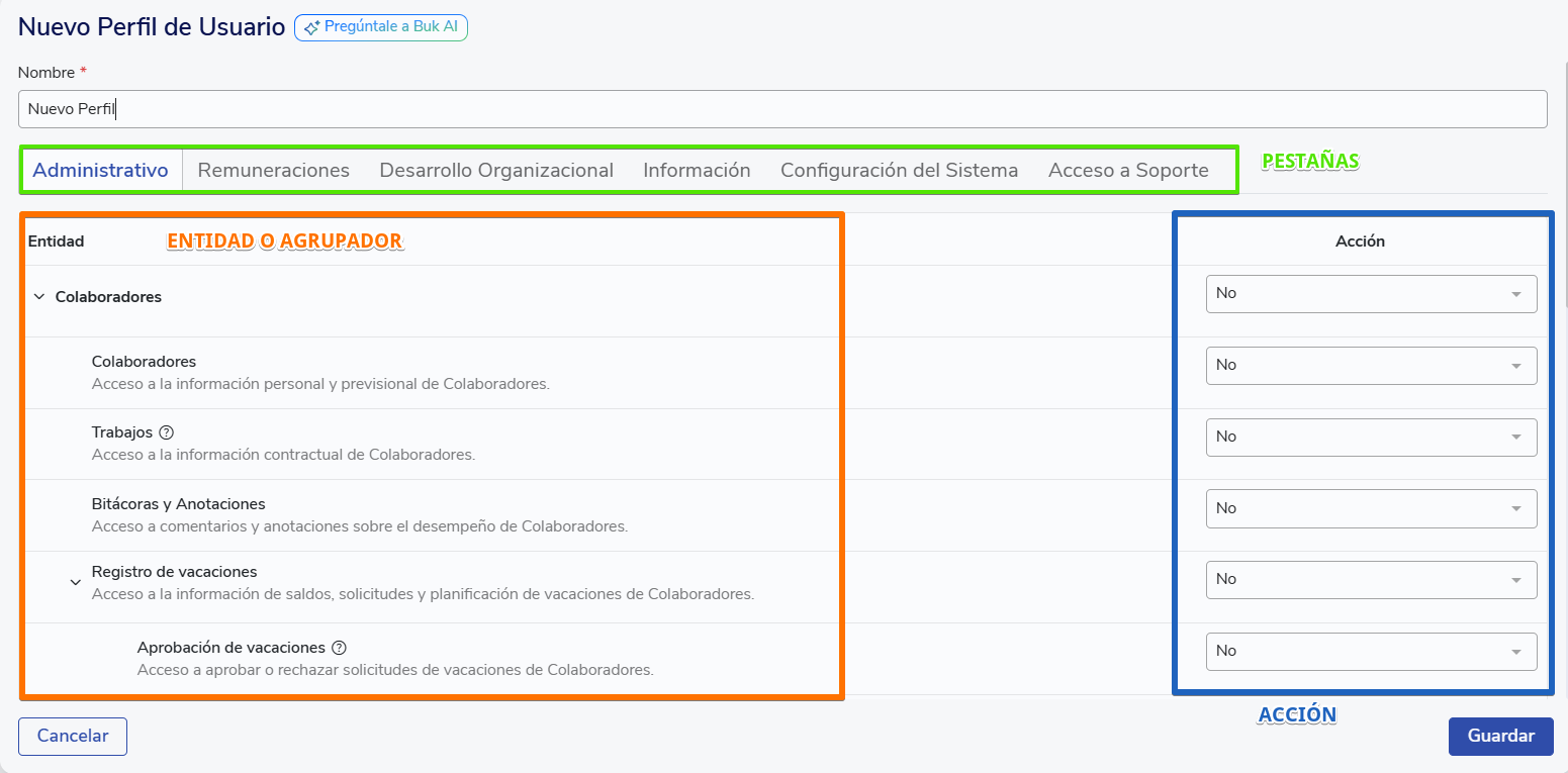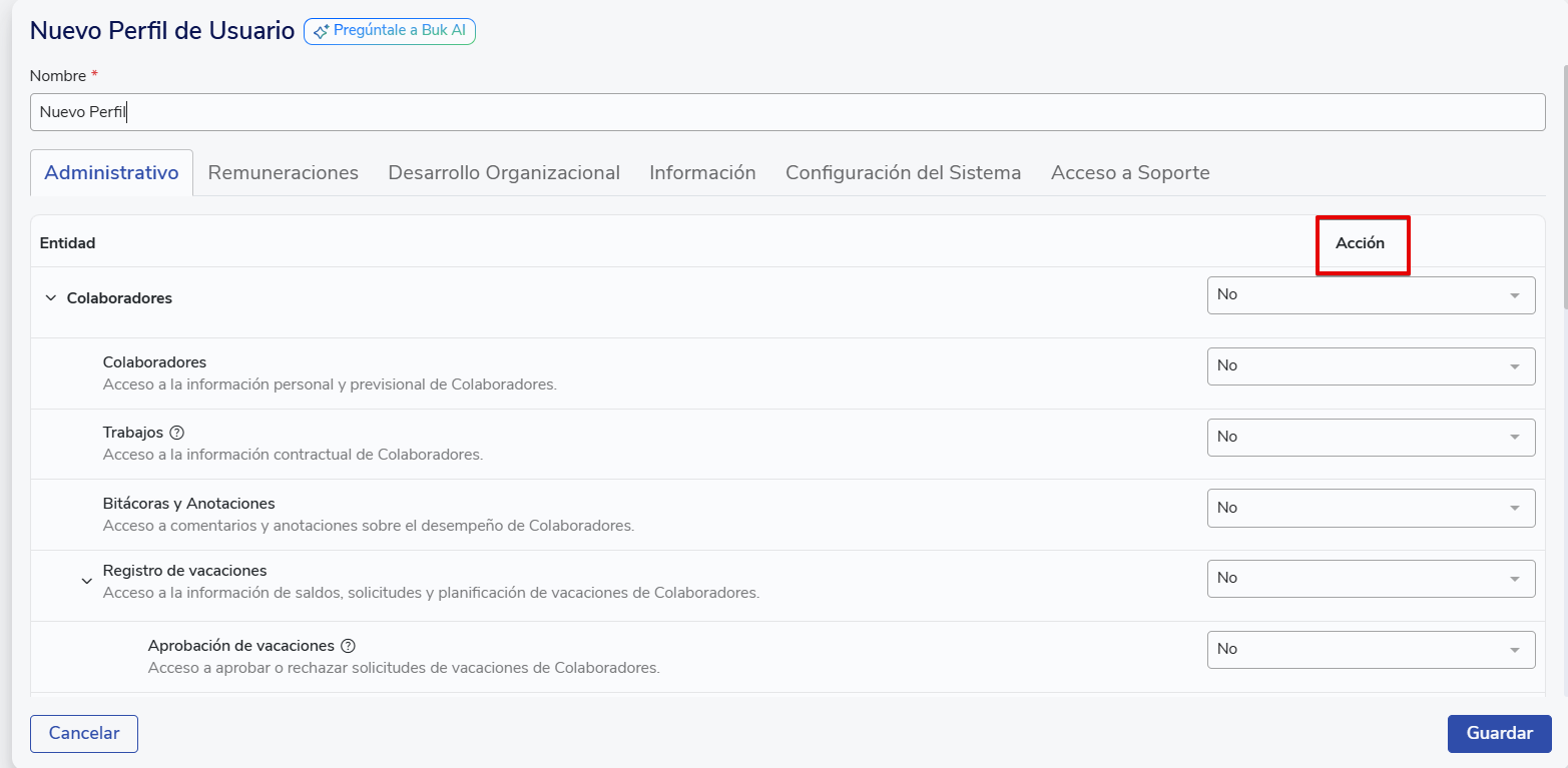 Thenormal profileis one of Buk's predefined profiles, intended for collaborators who access the platform with limited permissions. You can customize what information they can see on their personal profile and what actions they can perform, including additional permissions if they have people reporting to them.
