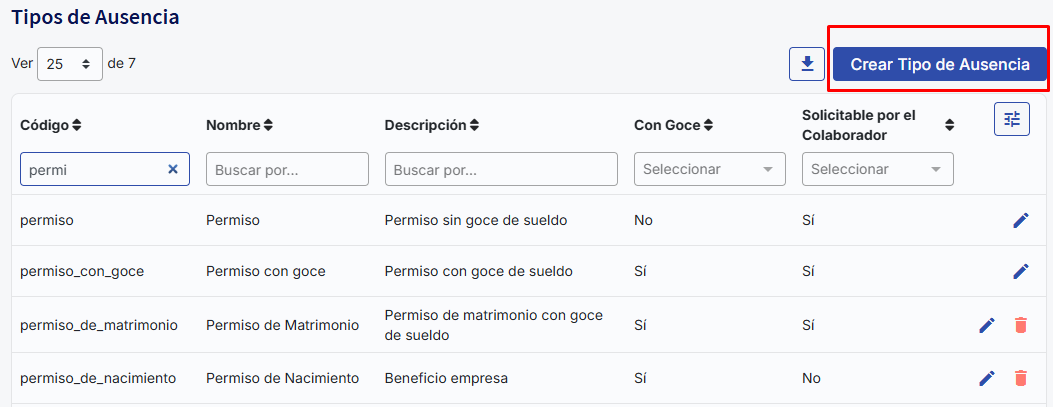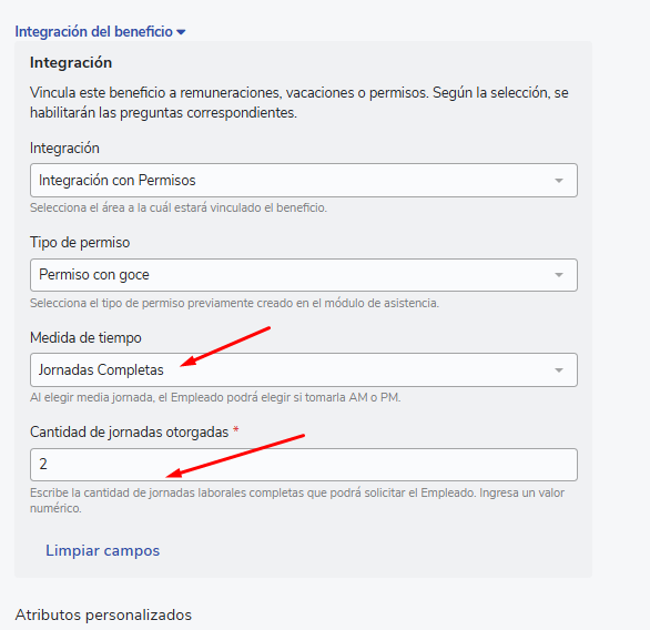 To ensure a new Type of Absence appears only in the "Integration with permission from Benefits" configuration andnotin the "Asistencia" tab of the employee's profile, you must not select the "Solicitable por el colaborador" option. Disabling this option will make the new permission available only when creating an integrated benefit with permission and not in the Attendance section for the employee.