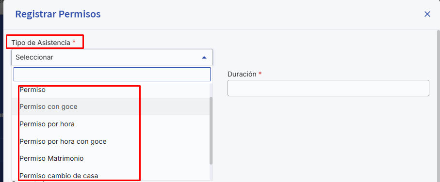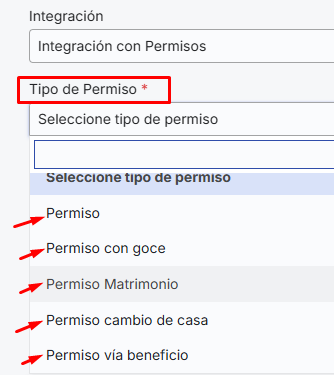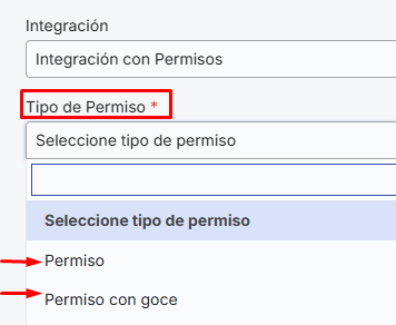 Next, you must select the"Type of permission", the options previously established in the "Types of Absence" section will be displayed. Remember that the essential plan will only show two options: "Permission" which is the unpaid option and "Permission with pay". Customers who have subscribed to the pro plan will be able to view and select the other absence types created in the previous step: