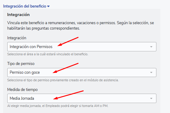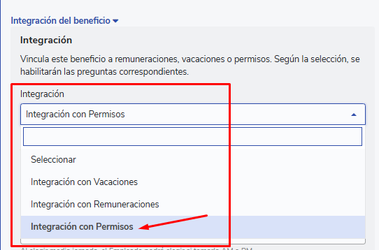 How to create a benefit. Upon reaching the option"Integration"you will find 3 options, you should select"Integration with Permissions":