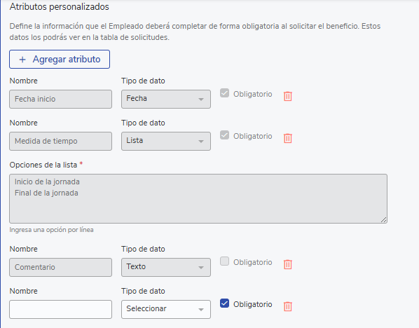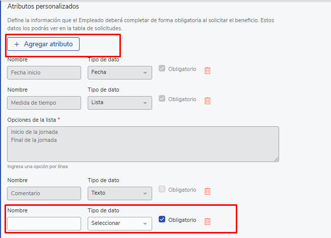 Once all the previous steps are configured you will find the "Add Attribute" section in which there are 3 fields locked for editing that cannot be modified as they are vital for the employee's request: