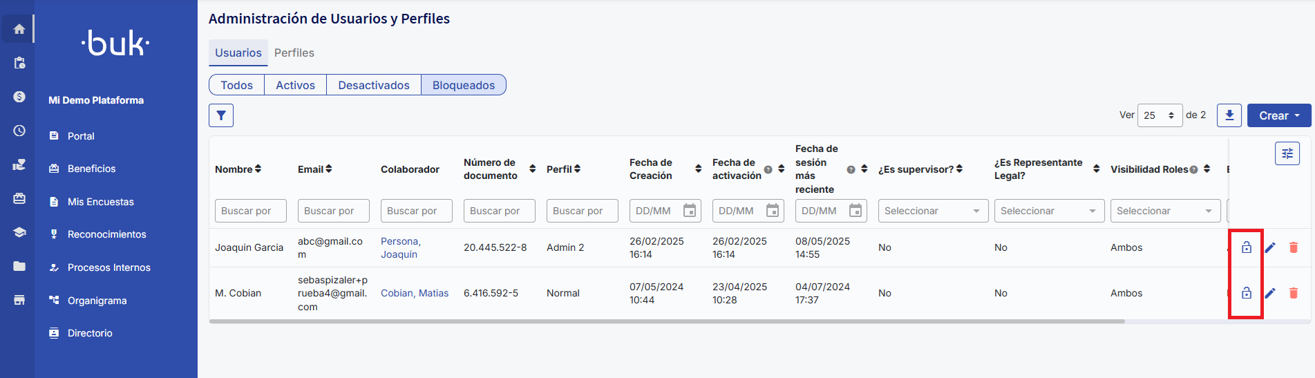 We recommend first trying the methods above, as they may be much faster. The administrator can go to theUsers and Profiles, locate the user under the""Blocked""and select the option""Reset password"". This will send an email with a link to the user to create a new password. The account will be unlocked once the password is reset.