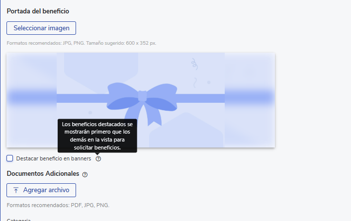 If you want the benefit to appear in the benefits carousel of the benefits section that employees will see, select the optionDestacar beneficio en bannersand upload the image that will appear in this carousel.
