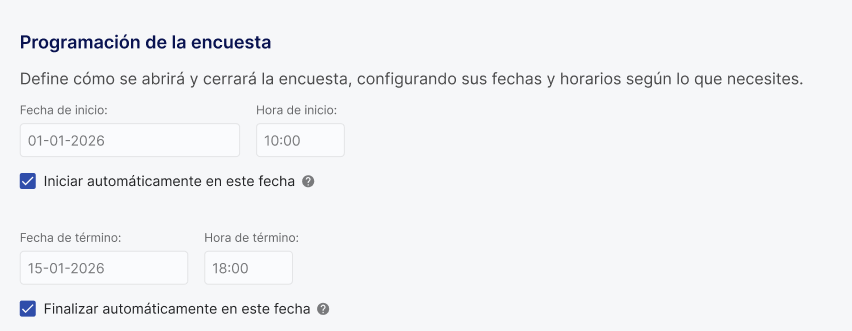 Start and end dates:In the "Survey scheduling" section, define the exact day and time when the first administration will start and end.
