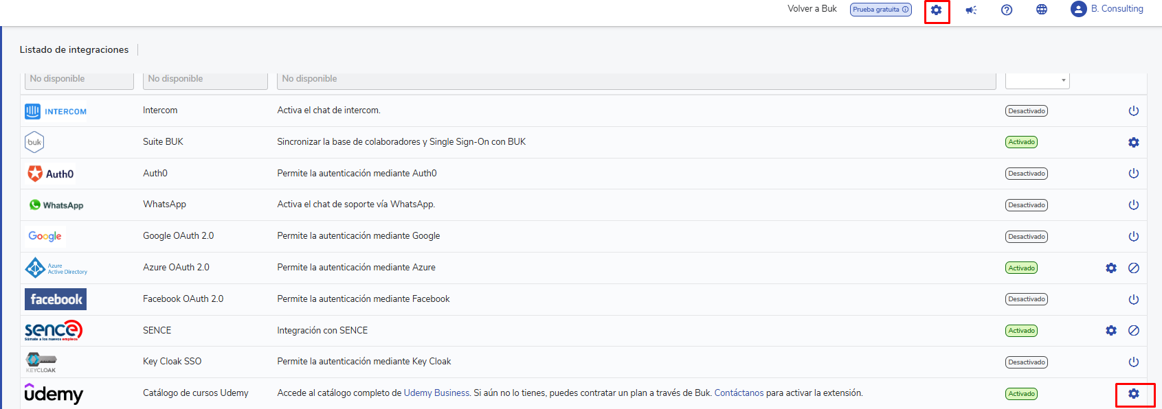 Si contrataste licencias de Udemy a través de Buk, el equipo de implementación o SAC se encargará de habilitar la integración en la sección "Integraciones", dentro del menú de Administración.