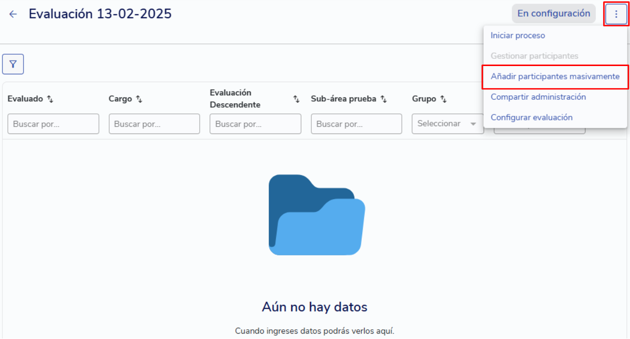 En el botón acciones, encontrarás la opción "Añadir participantes masivamente". La opción "Editar evaluaciones Manualmente" estará deshabilitada cuando hayas configurado la evaluación con "Habilitar múltiples evaluaciones".