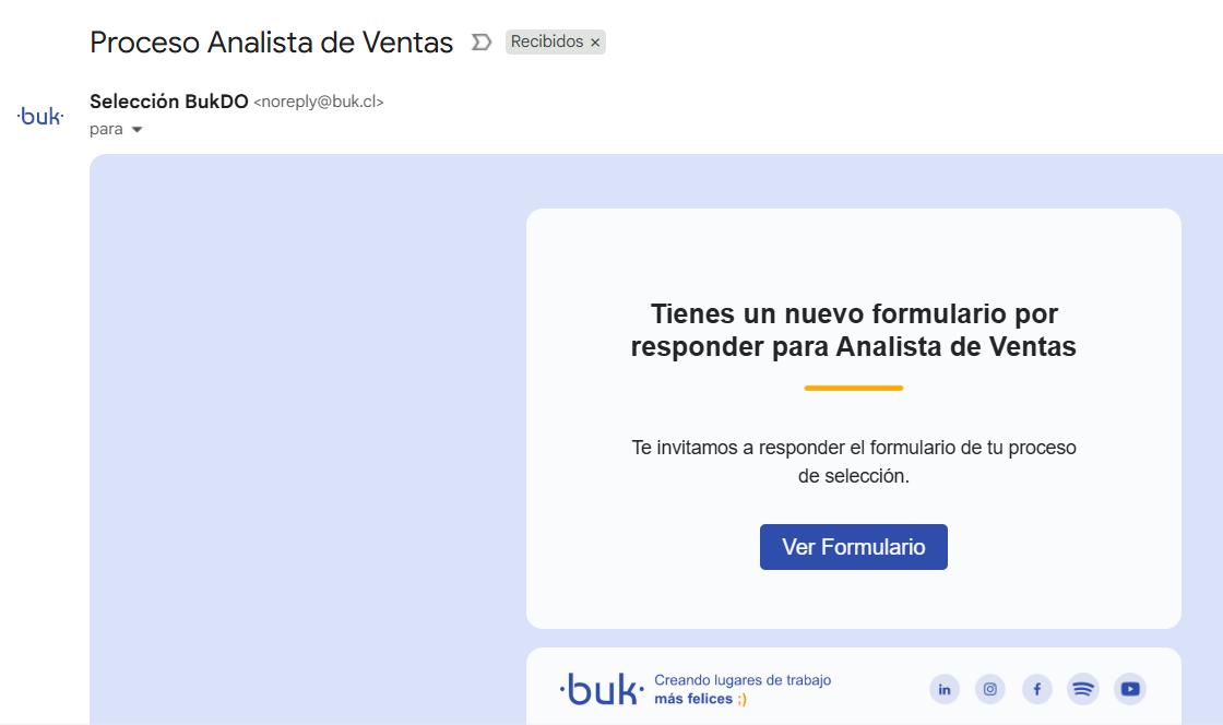 Mensaje de notificación por correo electrónico que recibe el postulante al ser incluido en un formulario