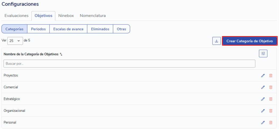 Por defecto, encontrarás las categorías "Personal" y "Organizacional". Puedes modificar los nombres de estas categorías o eliminarlas si lo deseas. Para crear nuevas categorías, haz clic en "Crear Categoría de Objetivo" y asígnale un nombre.