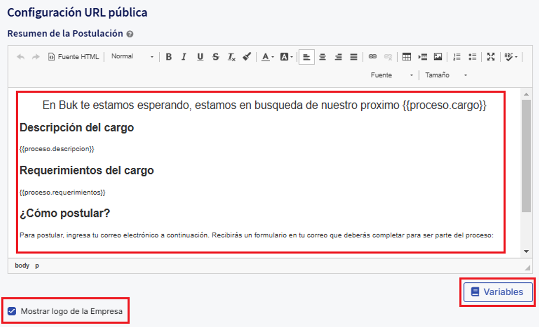 El artículo explica cómo acceder y configurar esta URL pública, detallando secciones clave como el "Resumen de la Postulación". En esta sección, puedes ingresar un texto personalizado que servirá como explicación para cada proceso; además, puedes incluir variables que permitan adaptar el contenido a cada proceso de selección creado. También explica como mostrar u ocultar el logo de la empresa en las publicaciones y se describe la sección "Detalles de la oferta", donde es posible elegir campos como el área, tipo de jornada, rango salarial, entre otros.