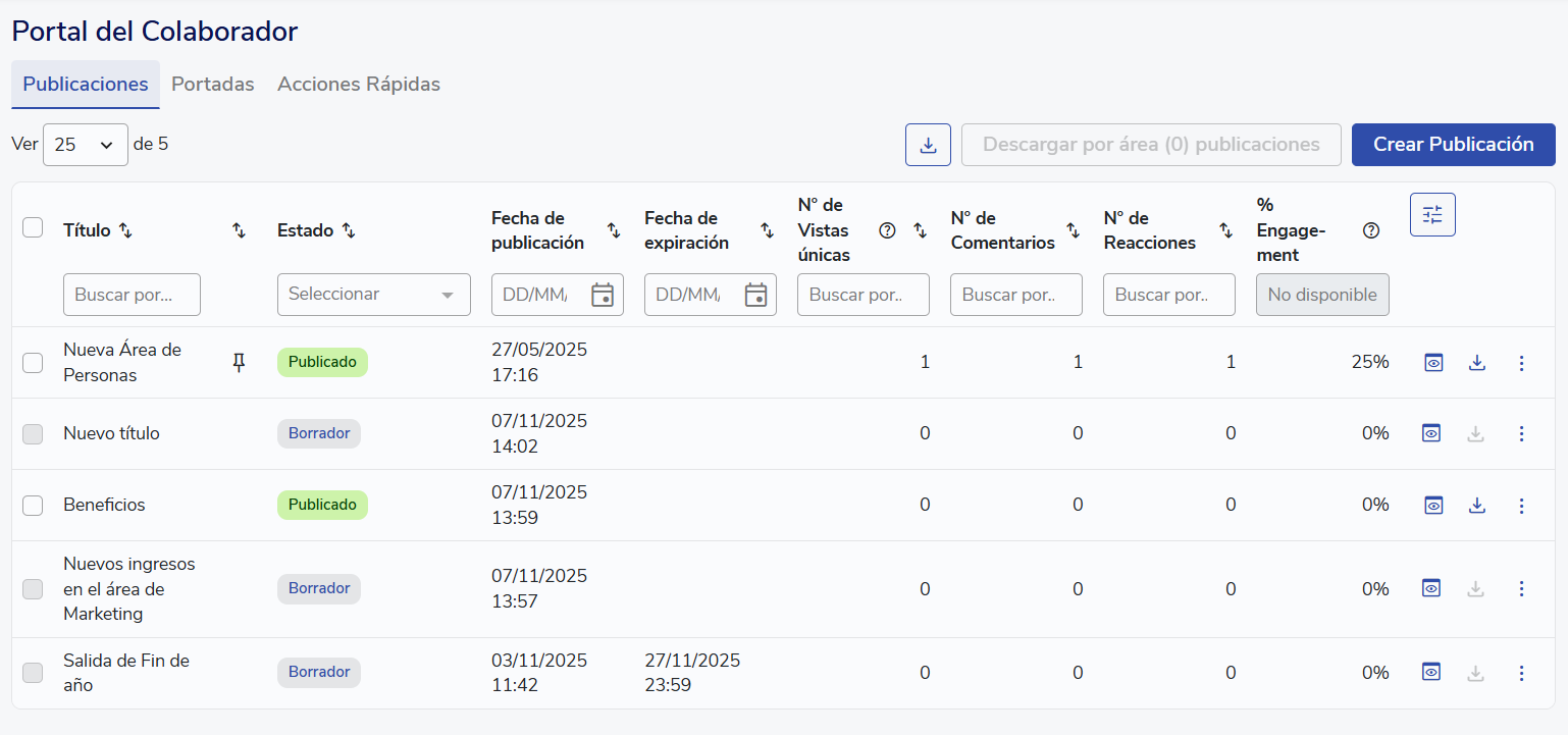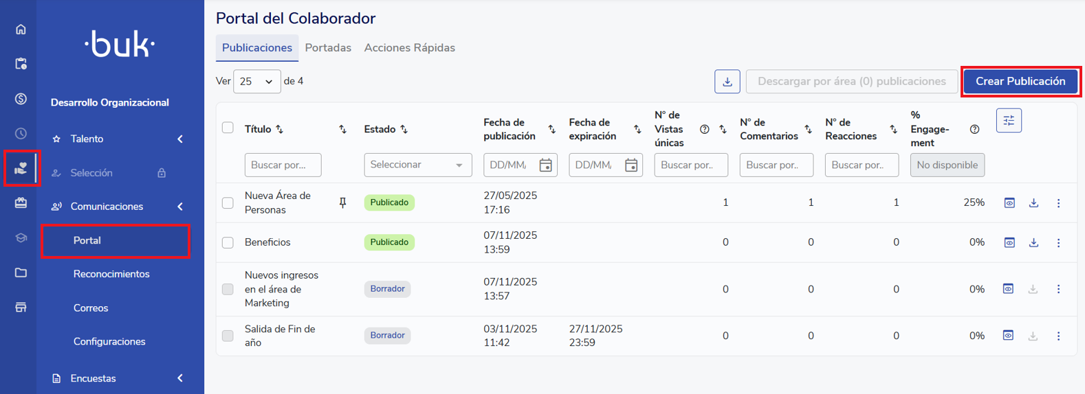Para revisar las publicaciones existentes y poder crear unas nuevas en el portal de Buk se debe ir a la barra lateral izquierda, entrar a Desarrollo Organizacional > Comunicaciones > Portal > Publicaciones. Hay que tener en cuenta que para poder realizar publicaciones se debe tener una ficha asociada al usuario.