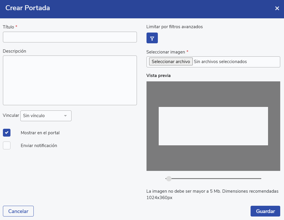 Para crear una portada se solicitará el título, la descripción, si se añadirá alguna foto y más configuraciones: