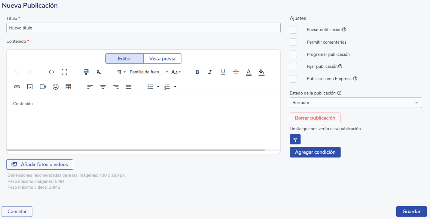 Para crear una publicación se solicitará el título de la publicación, el contenido de este, si se añadirá alguna foto o video y más configuraciones: