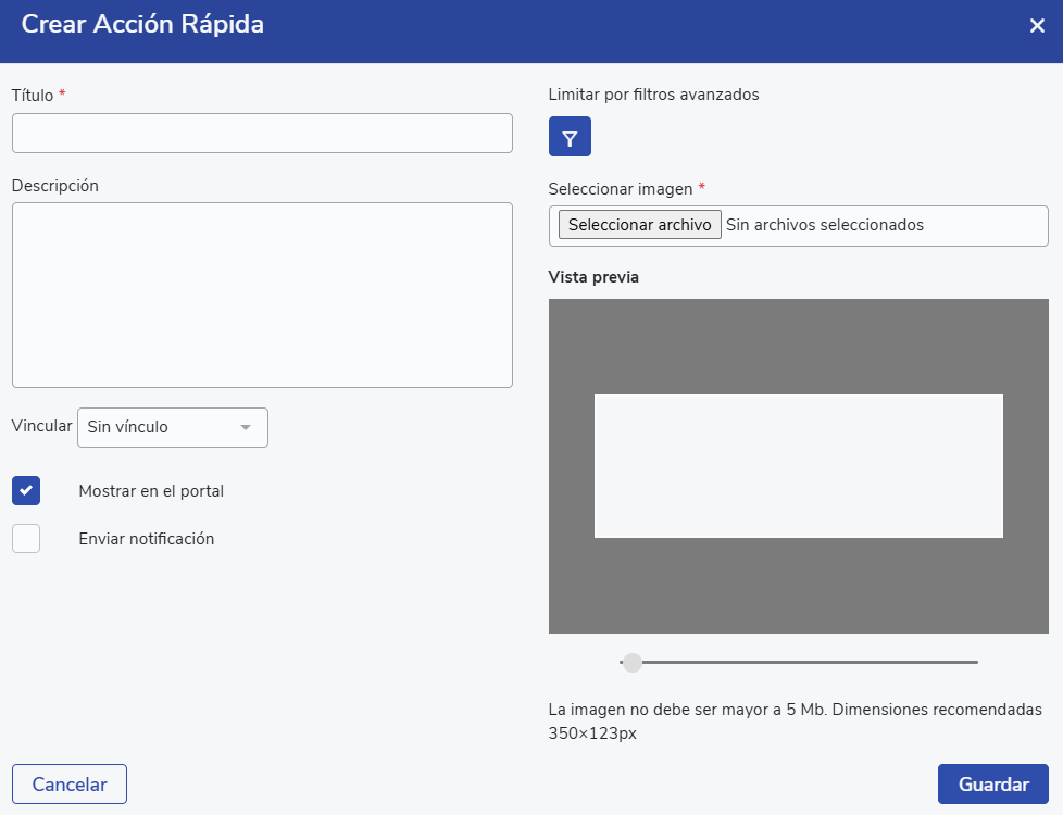 Para crear una acción rápida, al igual que en las portadas, se solicitará el título, la descripción, si se añadirá alguna foto y más configuraciones: