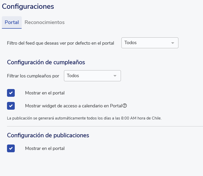 Filtro del feed que deseas ver por defecto en el portal: Para definir si se quiere mostrar por defecto las publicaciones, reconocimientos, cumpleaños o todos.