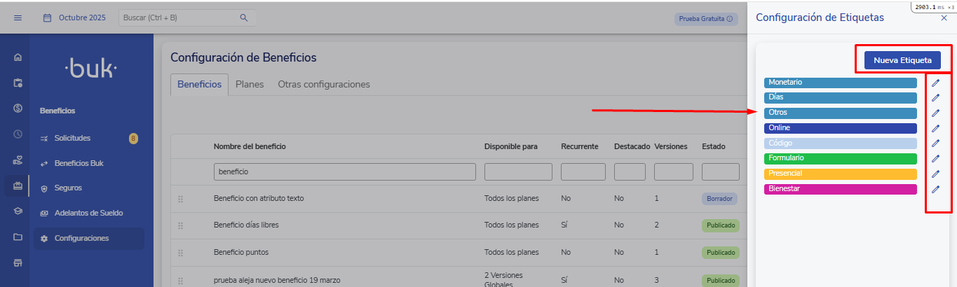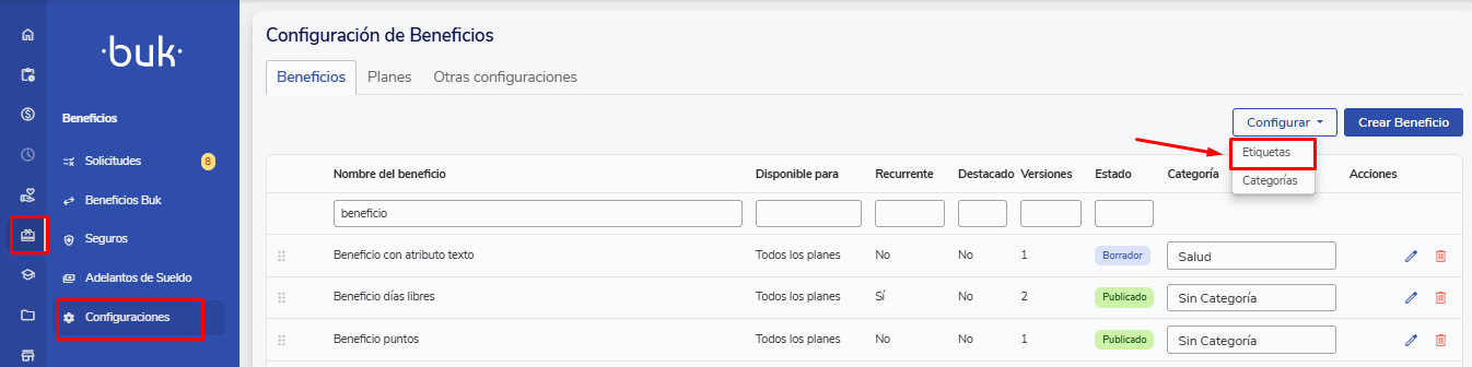 Puedes crear y editar etiquetas de beneficios desde Beneficios>>Configuración>>Configurar>>Etiquetas