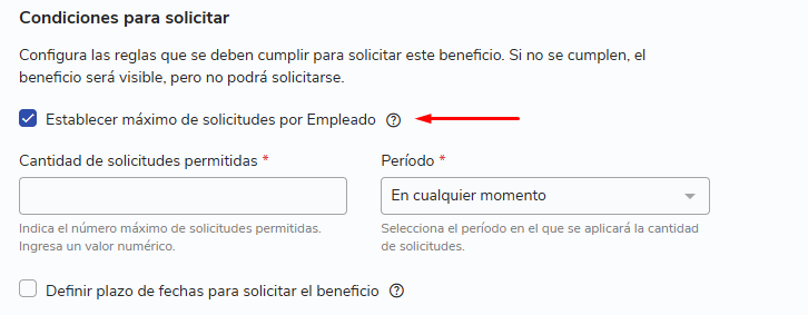Puedes limitar la cantidad de veces que un colaborador pueda solicitar un beneficio en la opción Establecer máximo de solicitudes por Empleado, en caso de no activar este check, el colaborador podrá solicitar el beneficio cuantas veces quiera.