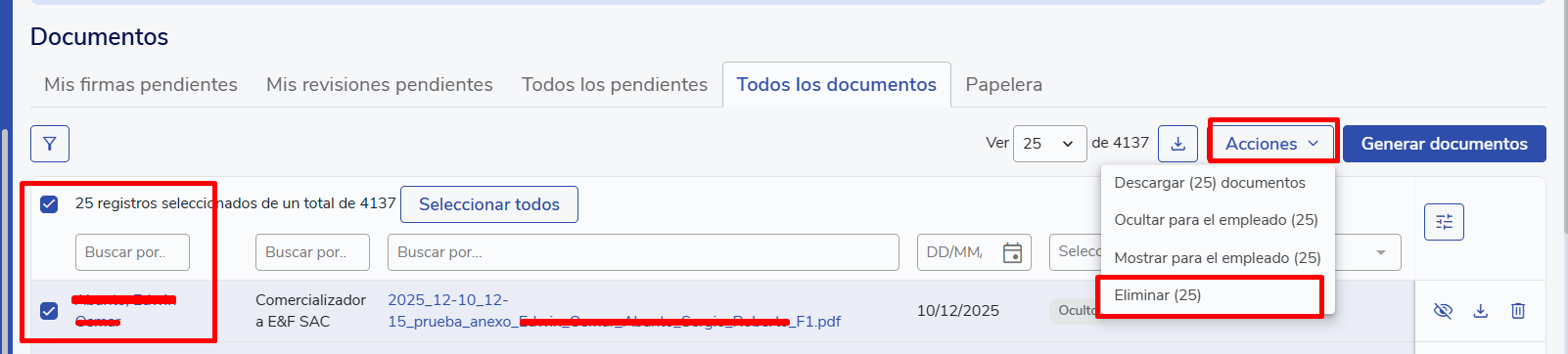 Debes primero seleccionar los documentos a eliminar y luego hacer clic en el botón "Acciones" >> "Eliminar":
