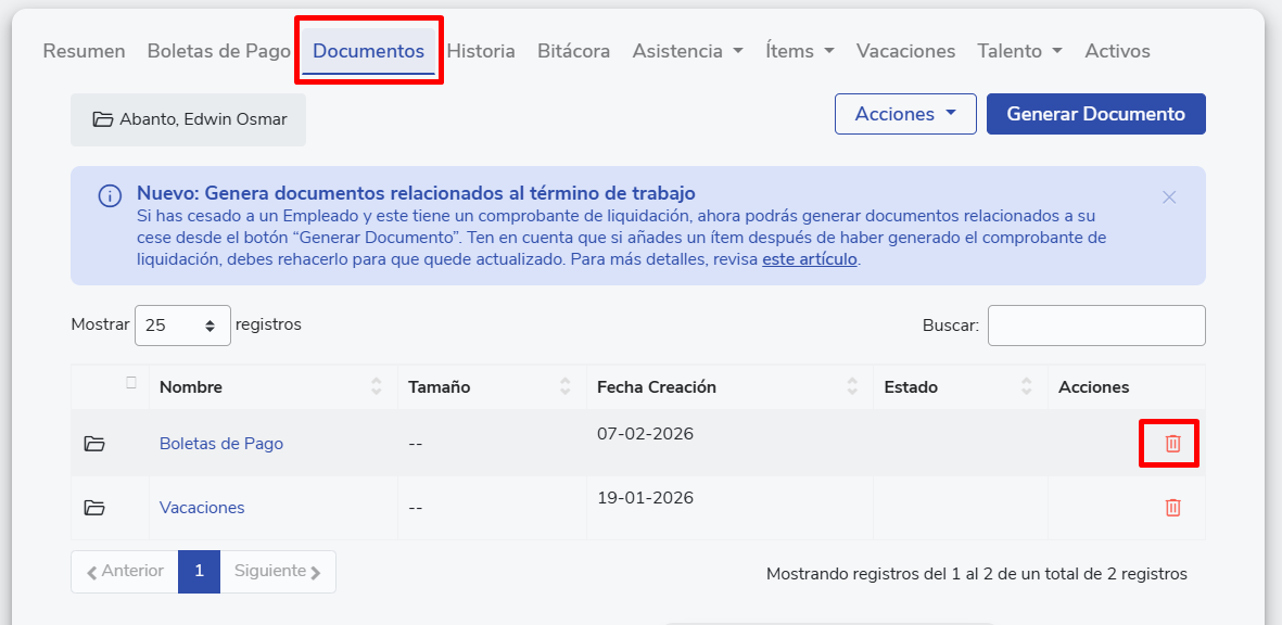 Debes dirigirte a la Ficha del Trabajador >> Pestaña "Documentos", donde figurará un ícono de tacho al lado derecho de los documentos disponibles para eliminar: