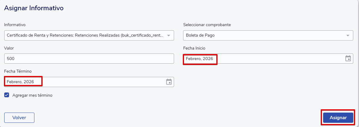Fecha de Inicio y Fecha de término: Se deberá registrar la misma fecha del mes activo en ambos casos.