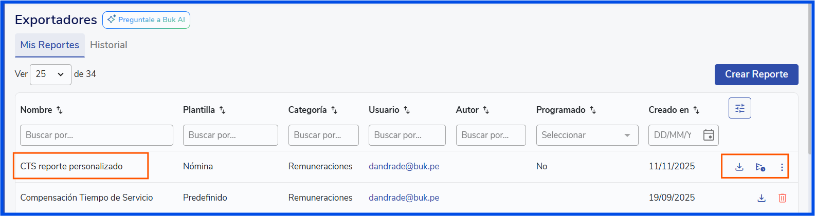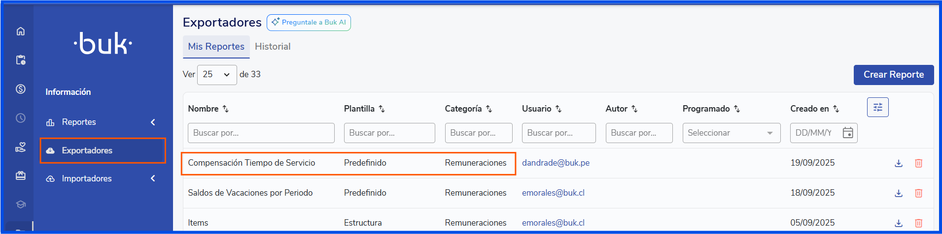 Si decides guardar, el informe aparecerá en el listado de exportadores y estará disponible para ser descargado las veces que lo necesites: