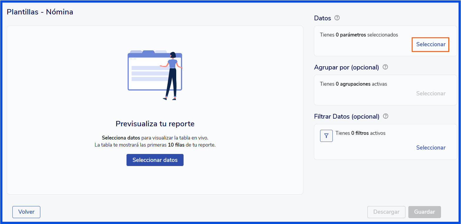 Para generar el reporte de validación desde un reporte personalizado (antes deberás verificar si ya cuentas con el reporte creado desde la etapa de implementación), de lo contrario, deberás dirigirte a Exportadores, luego seleccionar el botón de Crear Reporte, seleccionar el tipo "Remuneraciones" y finalmente dirigirte a la plantilla Nómina, una vez seleccionada la opción, verás el siguiente panel, en el cual crearás el reporte teniendo en cuenta la información de la ficha del colaborador y los ítems informativos (importes de calculo del proceso).