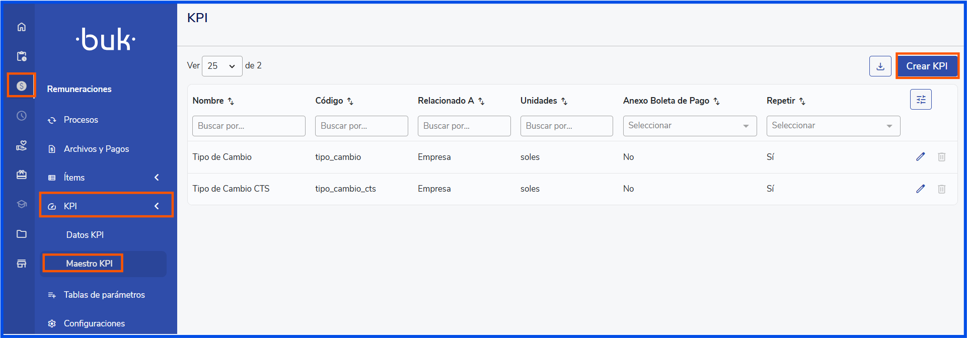 Para crear el atributo personalizado deberás dirigirte a Remuneraciones > KPI > Maestro de KPIs y crear el KPI con la denominación v_dolar.