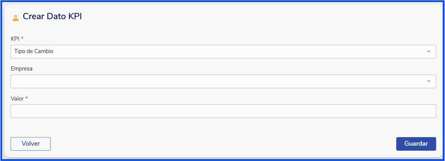En esta sección se deberá dar click a la opción Crear dato KPI y seleccionar el tipo de KPI, empresa y finalmente registrar el dato del tipo de cambio.