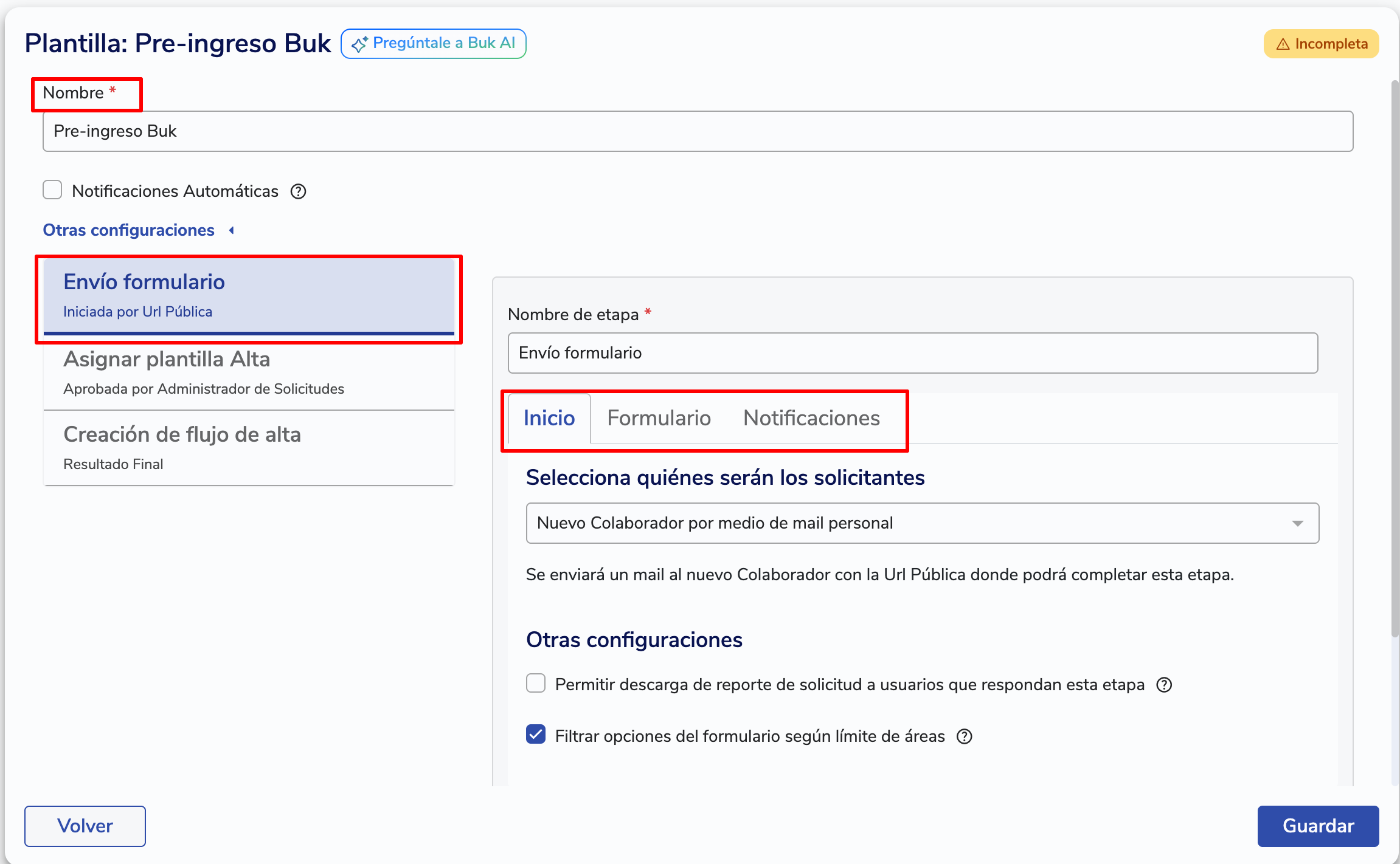 En la pestaña Formulario, elige qué campos debe completar el colaborador (rut, dirección, etc.).