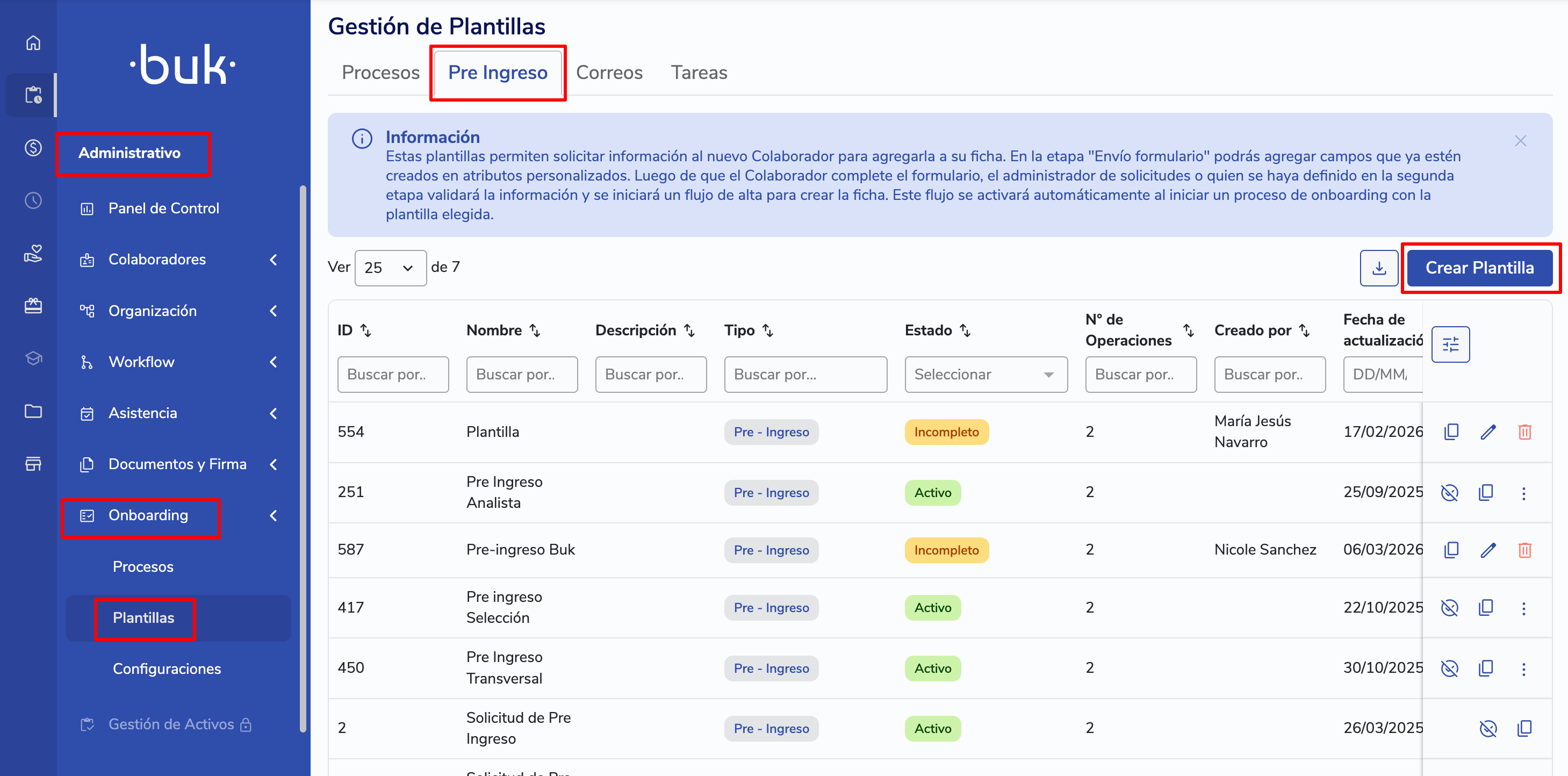 Para crear una nueva plantilla de pre-ingreso, ve a Administrativo > Onboarding >Plantillas y selecciona el tipo Pre-ingreso.