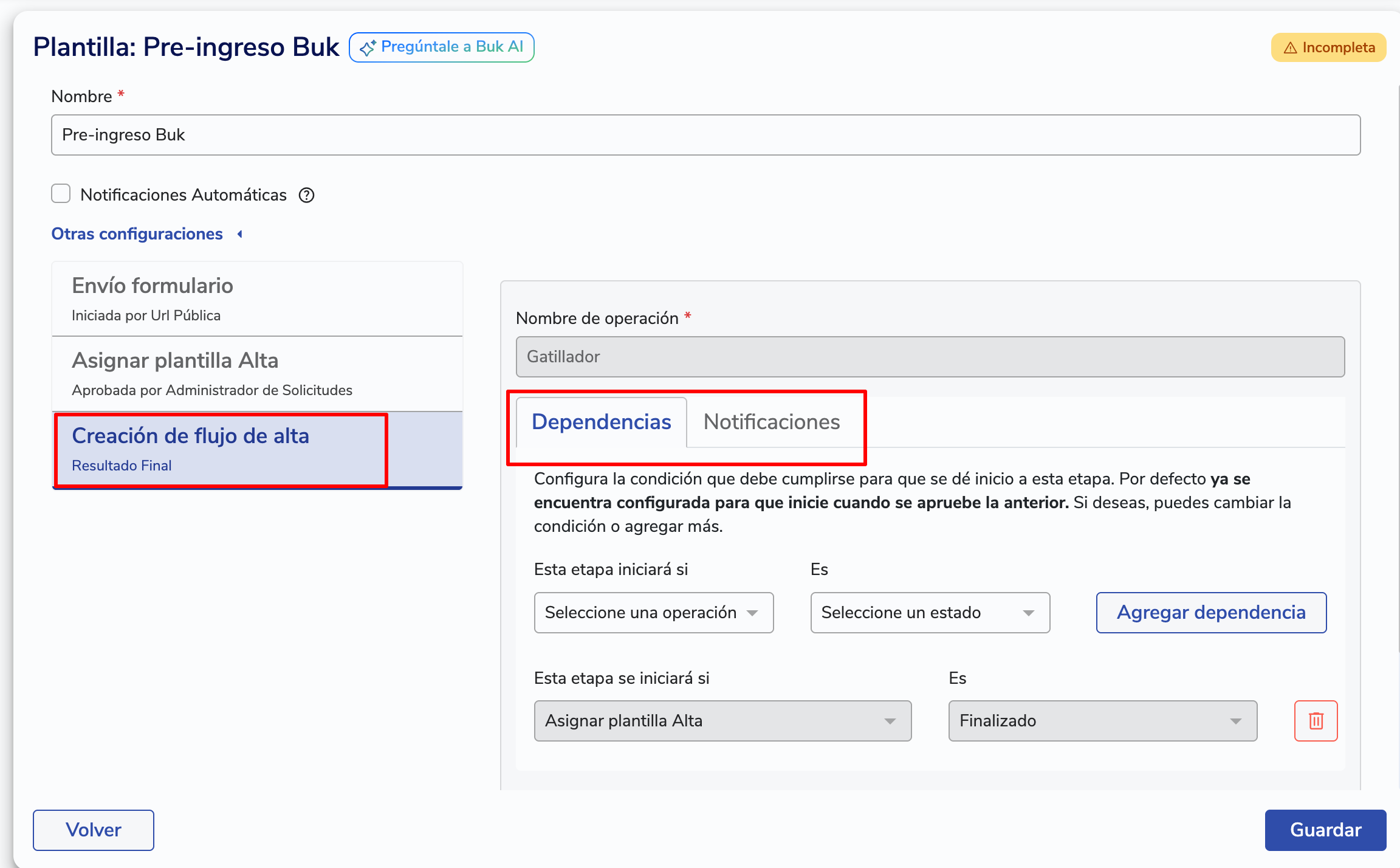 En Dependencias, se configuran otras condiciones para que se de inicio al alta, además de haber respondido el pre-ingreso.