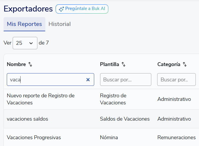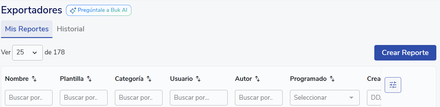 Para extraer el reporte de registros de vacaciones de tus colaboradores en Buk, deberás dirigirte al Módulo de Información >> Exportadores >> Mis Reportes, luego haz clic en Crear Reporte.