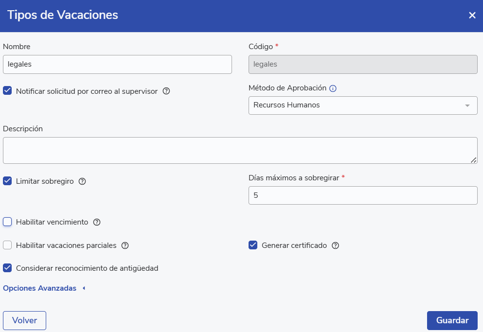 Limitar Sobregiro: Establece si permitirás que los colaboradores sobrepasen su saldo de vacaciones.