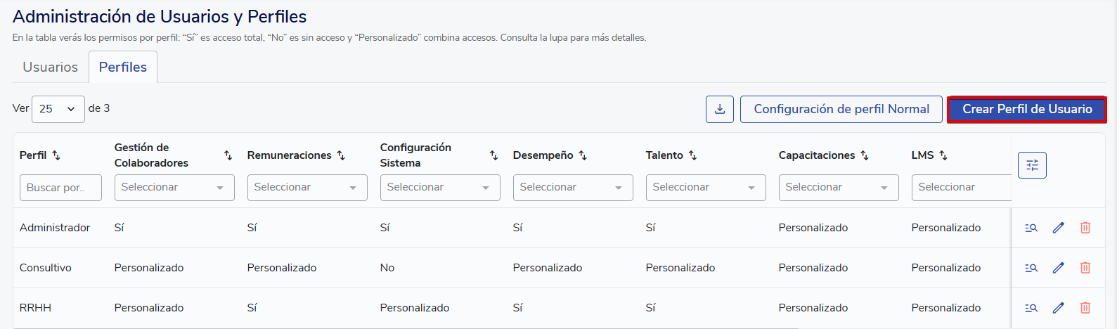 - Haz clic en el botón Crear Perfil de Usuario para generar uno nuevo, o selecciona el icono de lápiz para editar uno existente.