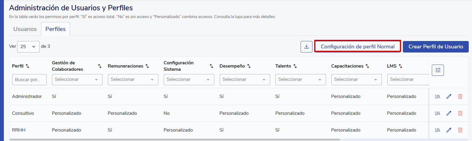 - Perfil normal: Perfil base asignado a los colaboradores. Puede ser configurado para definir qué información verán.