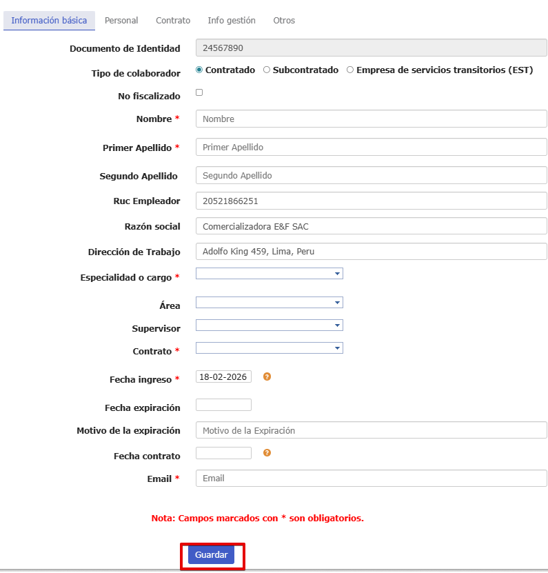 Los campos con (*) son datos obligatorios. Finalmente presiona en Guardar para agregar el trabajador con sus datos personales.
