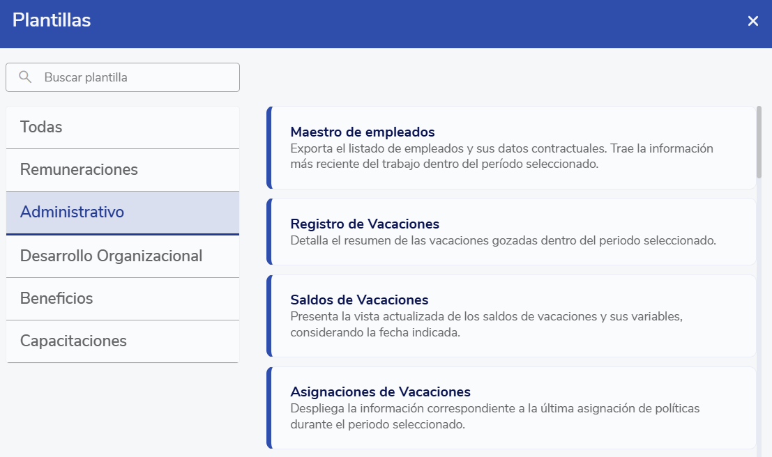 Este botón te llevará a una pantalla modal de Plantillas, donde podrás seleccionar diversas opciones. En la sección Administrativo encontrarás las opciones relativas a la gestión de vacaciones.