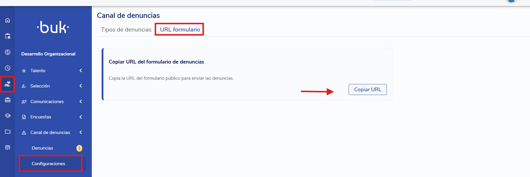 En el menú lateral, selecciona Desarrollo Organizacional, haz clic en Canal de Denuncias e ingresa a la pestaña Configuraciones.