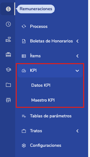 Para crear un KPI en Buk debes dirigirte al menú lateral de la plataforma haciendo click en Remuneraciones o Nómina. Allí elige la opción de "KPI".