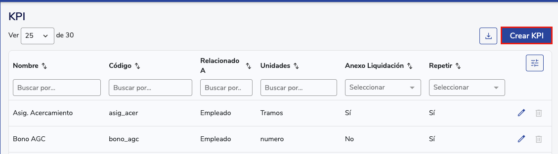 - Para hacerlo, dirígete al módulo KPI en la sección Datos KPI. Aquí encontrarás una visual que muestra todos los datos KPI asignados, y tendrás la opción de editarlos (usando el icono de un "lápiz") o eliminarlos (usando el icono de una papelera).