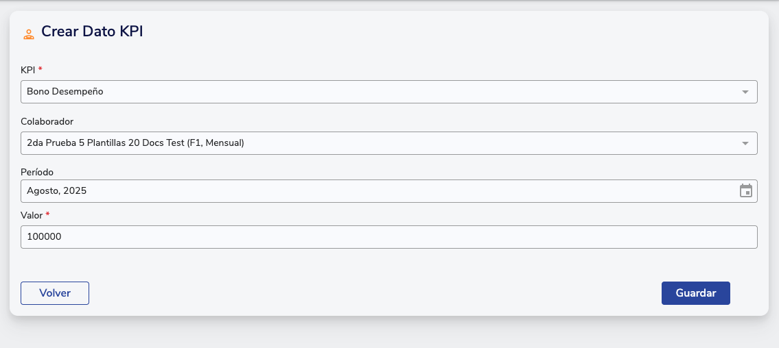 - Selecciona el KPI que deseas asignar (previamente creado) y elige el mes a partir del cual se aplicará el dato. Dependiendo de la relación establecida al crear el KPI, deberás especificar el empleado, empresa o área correspondiente, luego ingresa el valor del dato