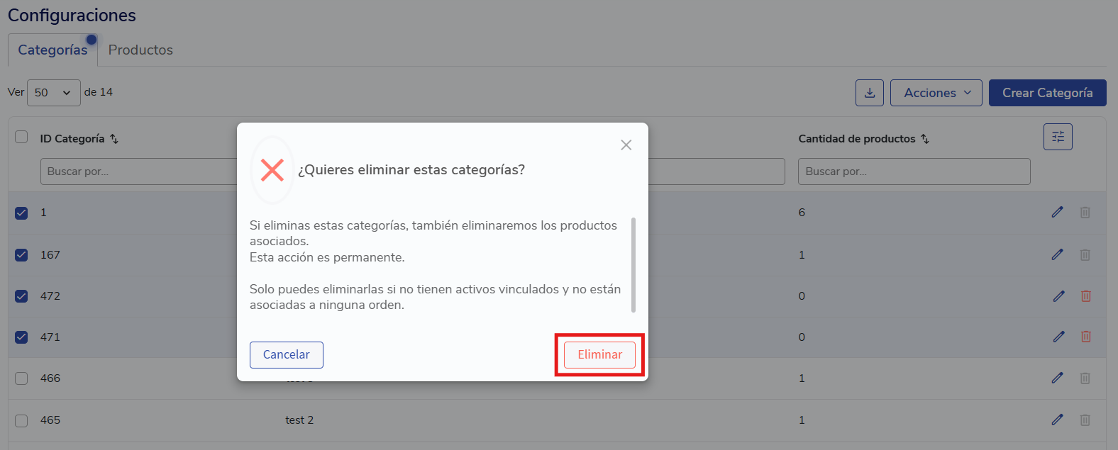 - Selecciona las categorías a eliminar. Luego haz clic en Acciones > Eliminar categorías.