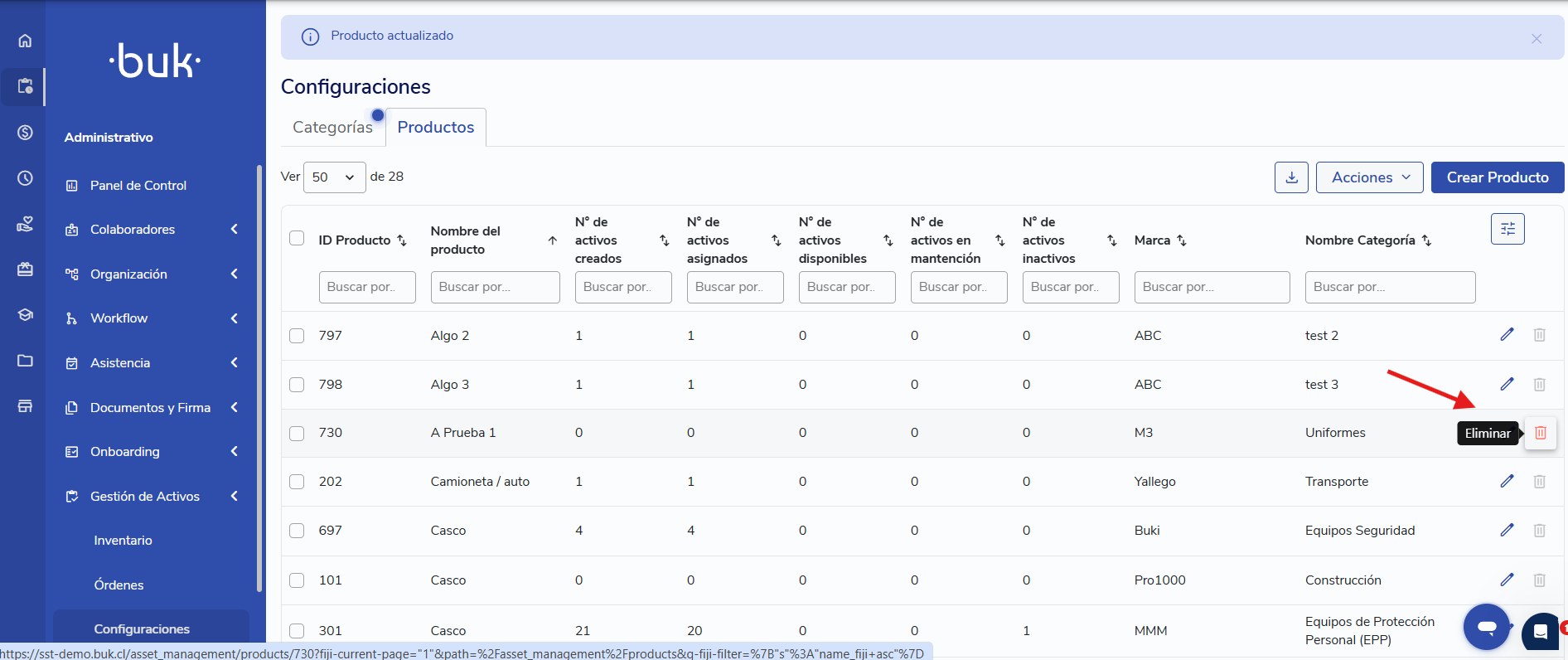 - Stock: En la vista de Producto, puedes ver el número de activos creados, asignados y disponibles, con esta información puedes ver de manera consolidada el stock, evitar quiebres y programar tus compras.