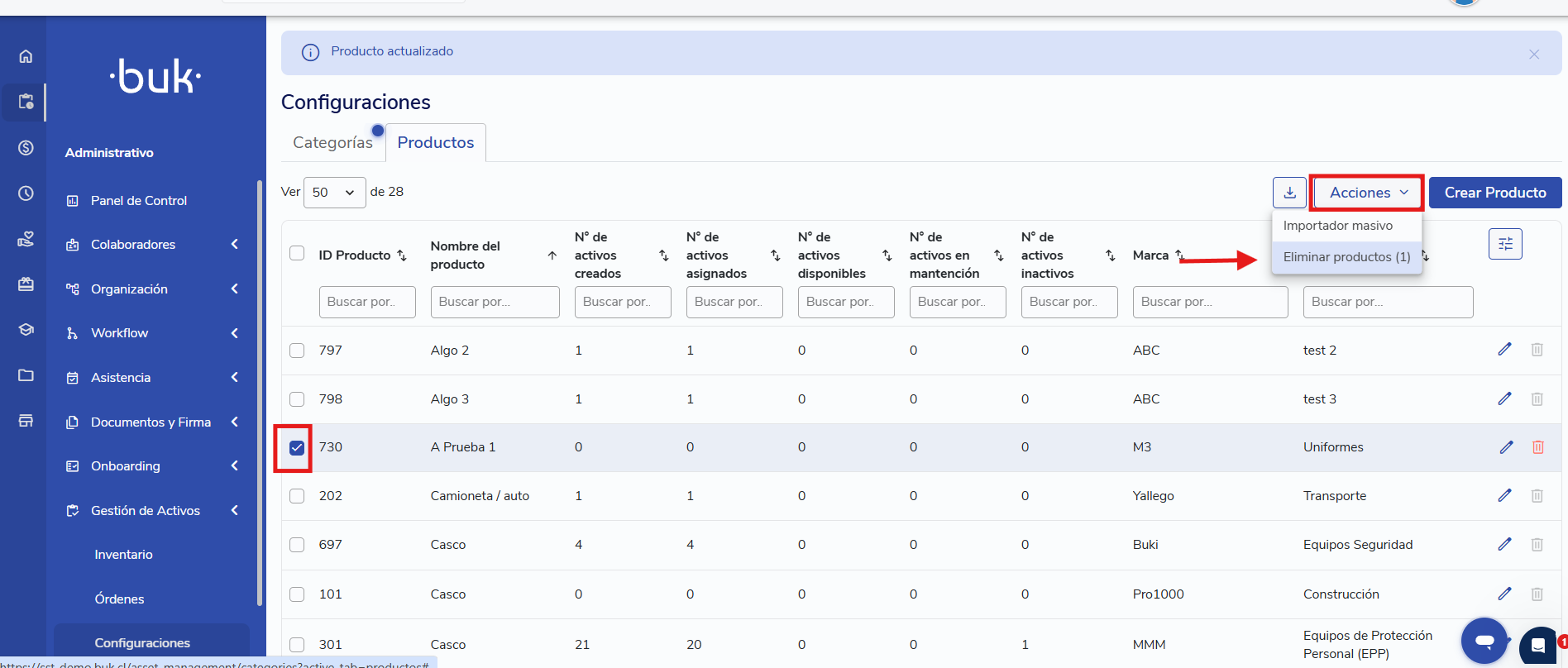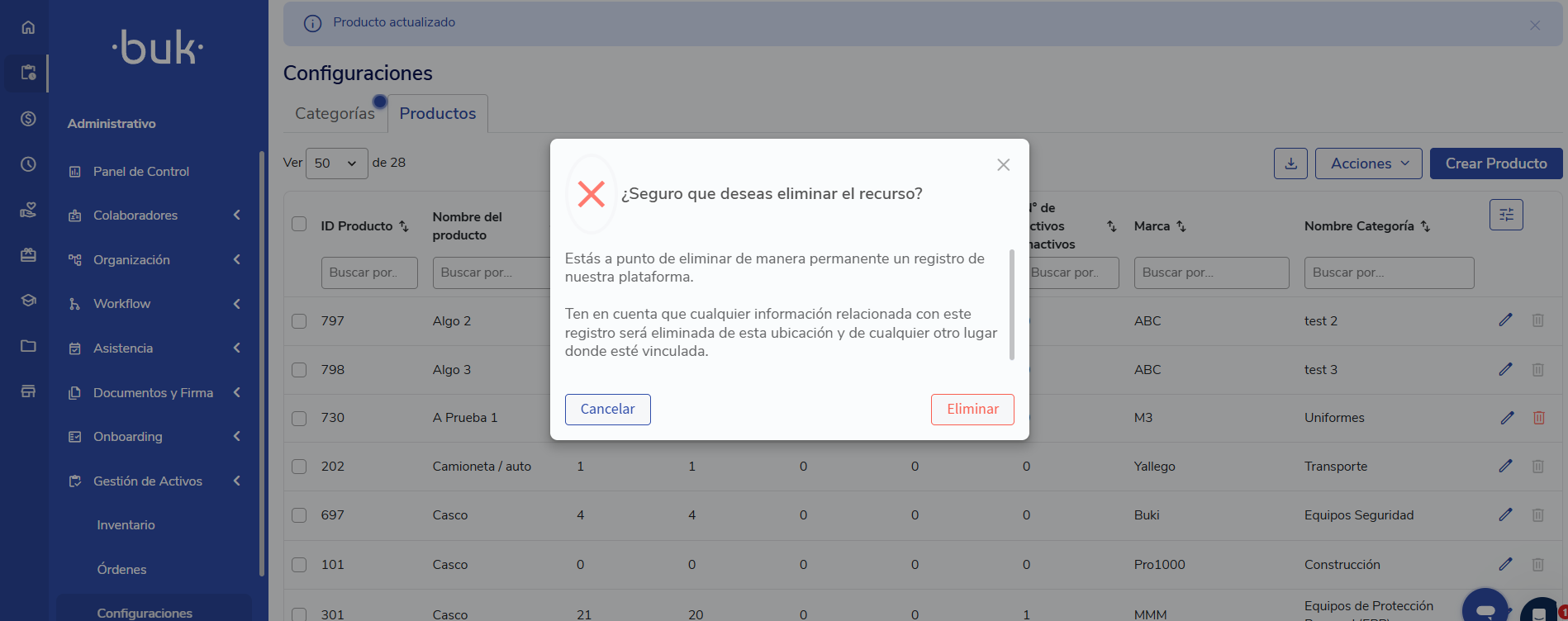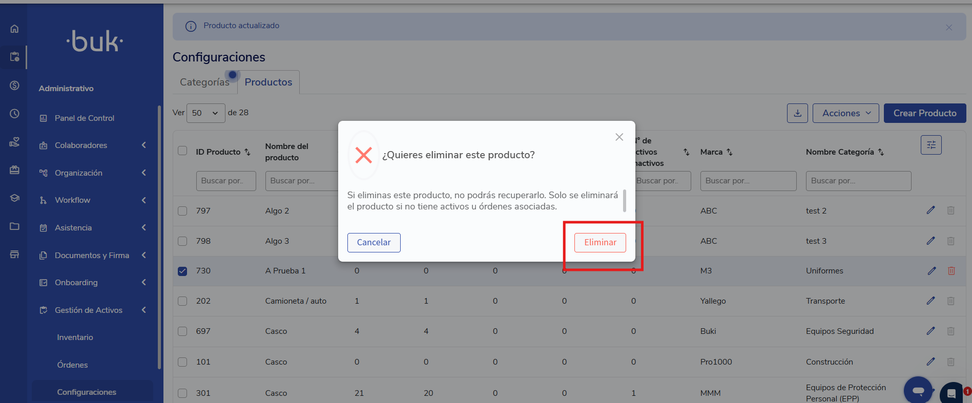 👍Validación 2: Sólo se podrán eliminar Productos cuando no existan Activos asociados a él.