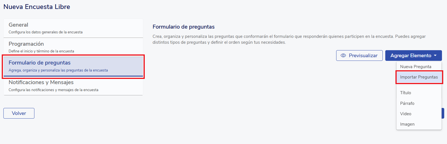 Para iniciar la carga masiva de preguntas, primero debes crear una nueva encuesta, completando las diferentes secciones de la configuración. Luego, en la sección de Formulario de preguntas, es posible importar todas las preguntas del formulario de manera conjunta para agilizar el proceso. Para ello, selecciona la opción “Agregar elementos” y luego haz clic en “Importar preguntas”.