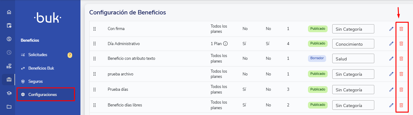 Los beneficios se eliminan en la sección "Configuraciones" del módulo de beneficios.